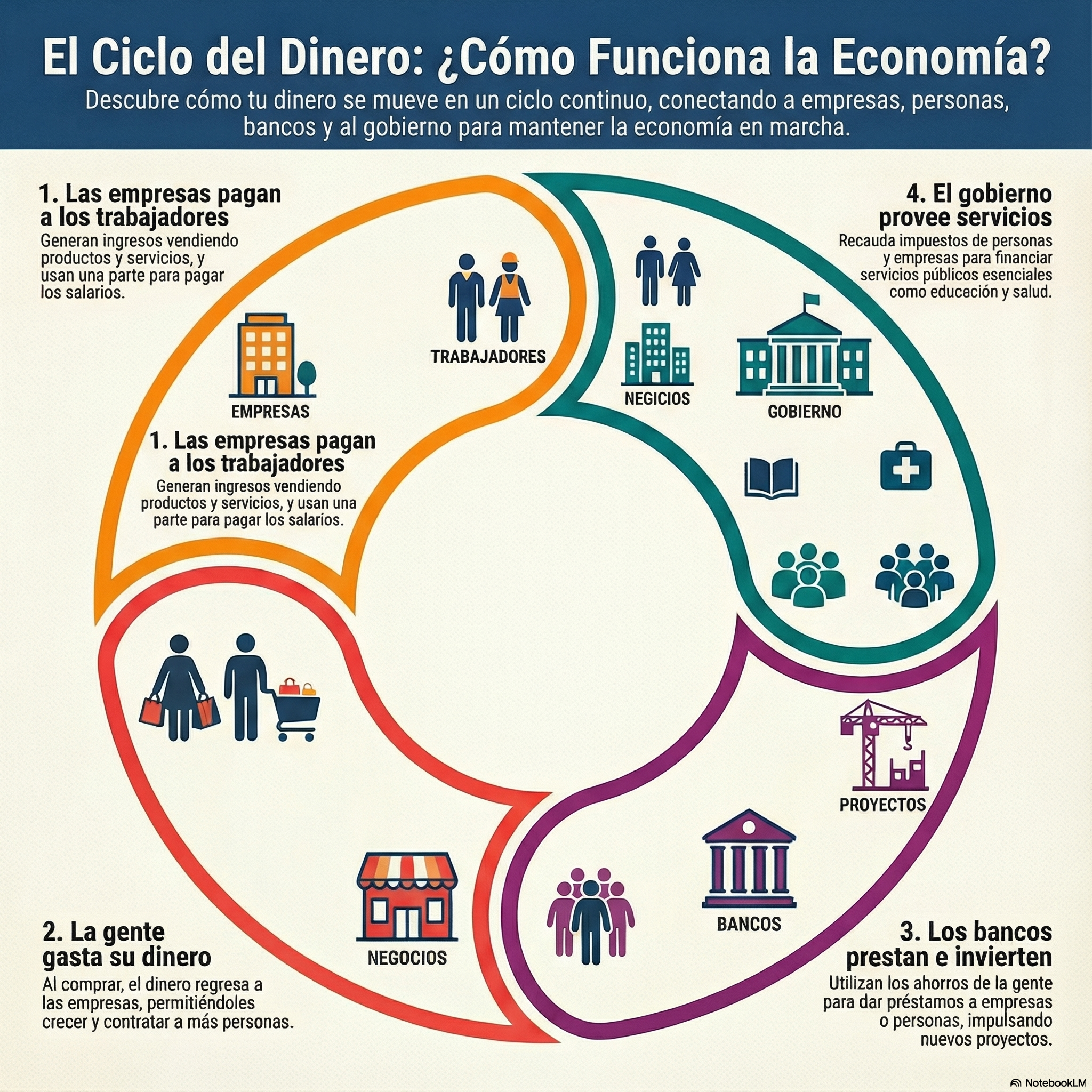 El dinero no aparece de la nada, ¡fluye! Comprender cómo circula el dinero en la economía es fundamental para entender cómo las acciones individuales impactan los sistemas económicos en general. Cada vez que ganas, gastas o ahorras, participas activamente en este flujo. Tus gastos ayudan a que las empresas crezcan, tus ingresos contribuyen a los impuestos que financian servicios públicos esenciales y tus ahorros permiten a los bancos prestar dinero a otros, impulsando así la actividad económica.